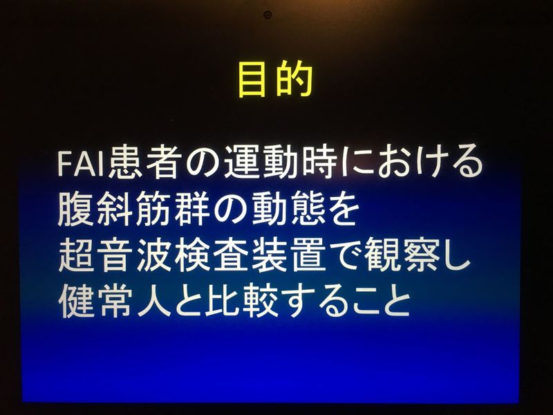 研究の目的は、FAI症状を有する方における運動課題を行なう際の腹斜筋群の動態を超音波検査装置で観察し、症状のない方と比較することです。