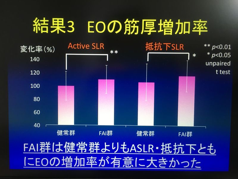 一方で外腹斜筋(EO)は重りのあるなしを問わず、FAI症状のある群の方が筋の厚さが有意に増加していました。