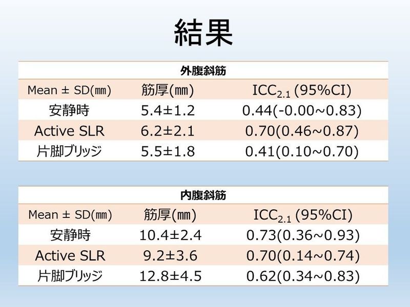 測定する人や運動課題によって腹斜筋の筋の厚さの測定は信頼性が異なるという結果を得ました。