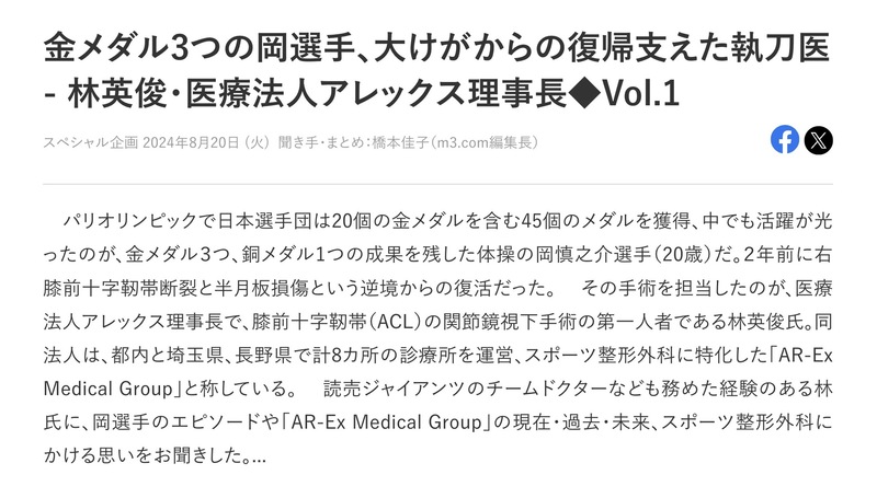 当法人の林医師が「m3.com」に下記の記事に取り上げられました。本記事では、医師としての知見とスポーツ選手に対する関節鏡視下手術について紹介されています。