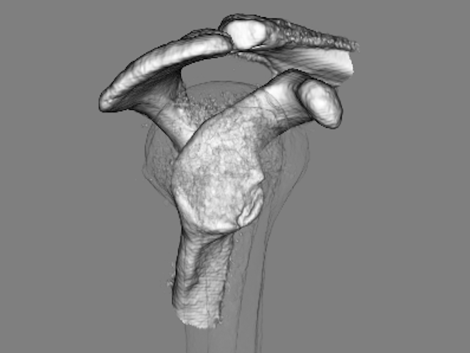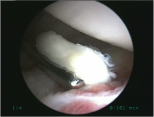 現病歴:ソフトテニス中に右肩関節を外転外旋位でボールを打ち返した歳に脱臼感が出現しました。佐久平整形外科クリニック受診し右肩関節唇損傷の疑いで3ヶ月間リハビリテーションを行いましたが、症状改善なく造影MRI検査施行し、結果より前方関節唇損傷・骨性Bankart病変と診断されました。疼痛・脱臼感などの症状改善がみられず競技継続を希望されたため、鏡視下肩関節唇形成術を施行し、その術中で遊離体を発見したため摘出術も施行しました。