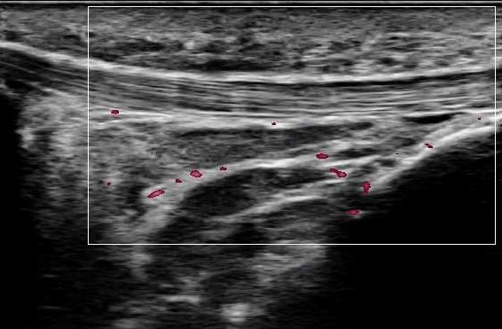 レントゲン:明らかな損傷なし超音波:膝蓋腱・膝蓋下脂肪体 炎症反応+