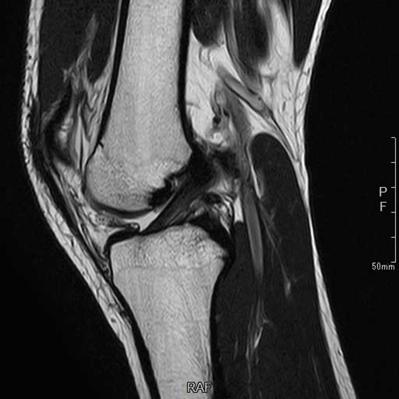 前十字靭帯を損傷するスポーツの場面は大きく分けて2種類あります。ラグビーなどのように相手に膝に直接タックルされることや、バスケットボールなどでジャンプの着地時に相手に直接的に膝に乗られてしまうなど膝に直接外力がかかり前十字靭帯が損傷する接触型の損傷といいます。もう一つの種類はサッカーなどのステップ動作中や体操競技の着地時に膝をねじってしまうことで膝に直接外力がかからない状況で前十字靭帯が損傷する非接触型の損傷です。前十字靭帯が損傷するとレントゲン画像だけではわかりませんが、MRIは大きく変わります。正常な前十字靭帯は黒く太いものがうつっていますが、損傷すると靭帯の連続性がなくなったり、靭帯がはっきりうつらなくなります。