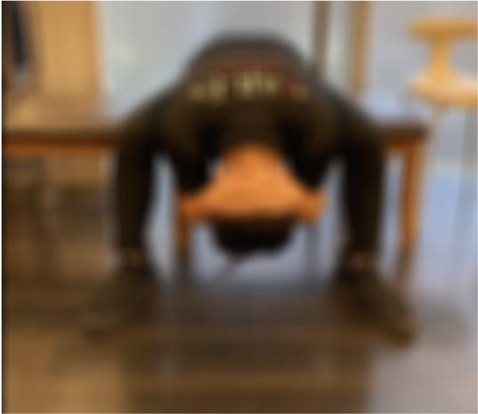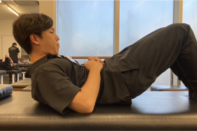 3点腹筋・頭頚部とお尻をあげて背中をおしながらゆっくり体をおろしていきます