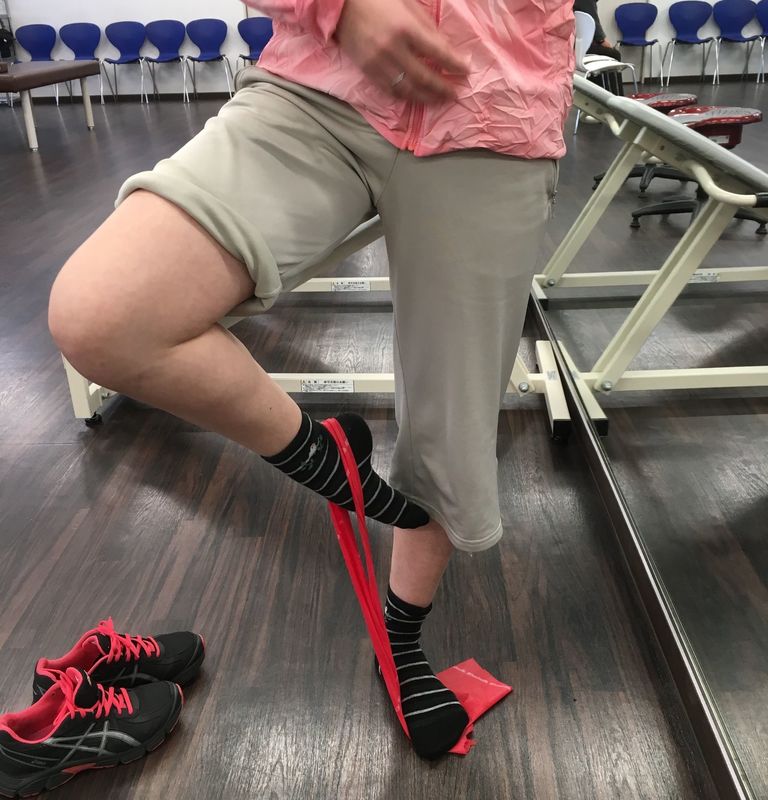 下腿外旋があり移植腱として使用した半腱様筋の収縮が入りにく状態でしたが、パッセの姿勢を保つためにも内側ハムストリングスの収縮は必須であり、同部の収縮を促すトレーニングを重点的に行いました。荷重下トレーニングは再受傷予防のため片脚でのスクワットやリーチ運動を反復して行いました。