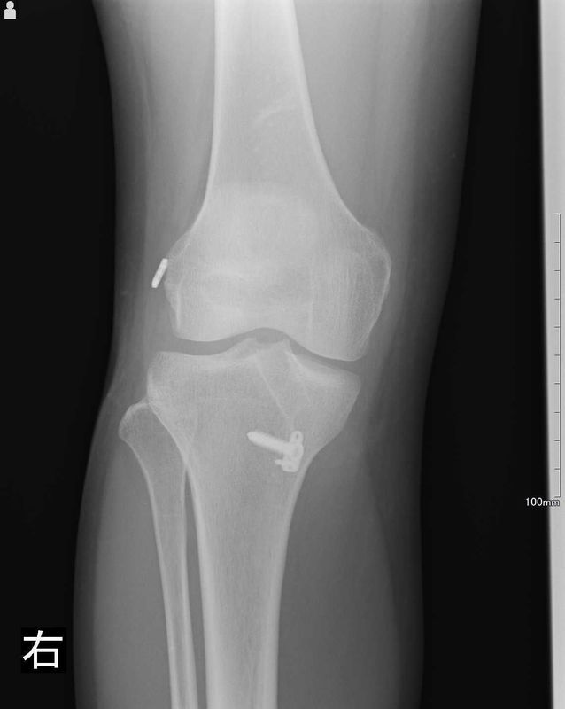 - 現病歴:2010年頃に反復横跳びを行った際に右膝を捻り他院で右膝ACL損傷と診断をうけた。その後2016年1月に仕事中に自転車運転中に路面が凍っていて転倒し右膝を強打した。都立大整形外科クリニック林医師を受診し、MRI検査の結果、右膝ACL損傷と診断をうける。ヨガで胡坐をとった際の痛みと腫れが出現していた。運動時の炎症と膝の不安定感がなくならないことからACL再建術を施行した。
