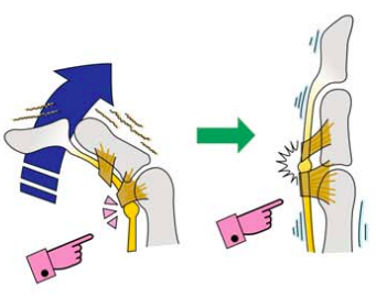 - 曲がった指を無理に戻そうとして力を入れるとカクンと跳ねる(ばね現象)