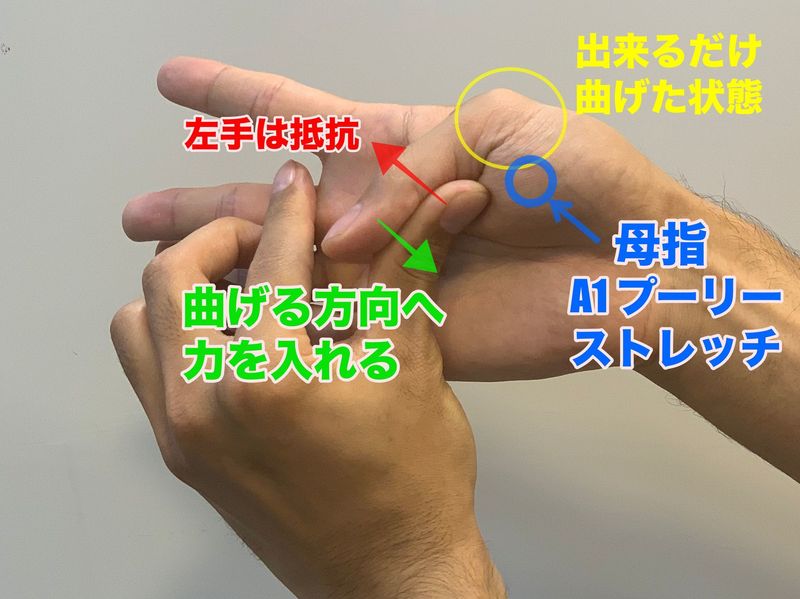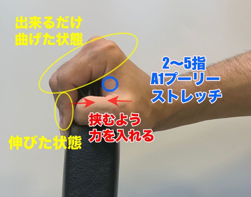 人差し指、中指・薬指・小指に対するA1 pulley ストレッチ