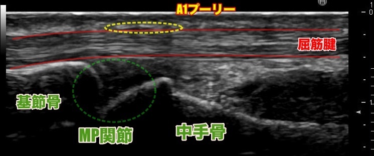 A1プーリー周囲が硬くなっている場合(滑走障害)、A1プーリーや屈筋腱に沿ってマッサージや滑走改善を行うように努めます。