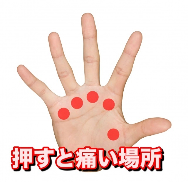 - 手のひら側の指の付け根に押した痛みや腫れ、熱を持った感じがある