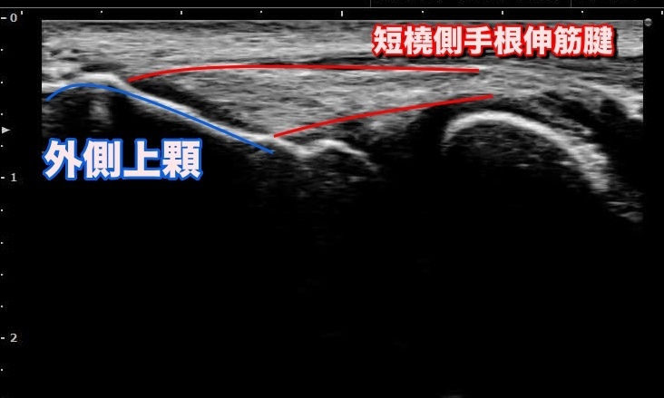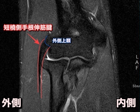 サポーターを実施することで、伸筋腱の付着部である外側上顆付着部にかかる負担を減らすとされてます。