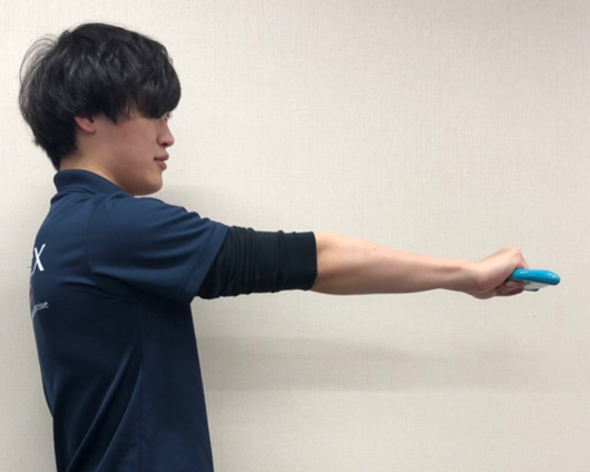肘を伸ばし、手首を上に反らした状態でキープします。相手が下方向に力を加えた際に、耐えれるか?肘の外側に痛みが出るか?