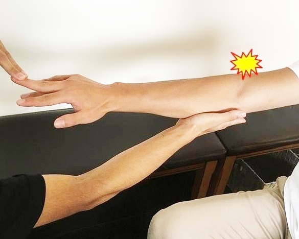 肘を伸ばし、手首と指をを上に反らしパーの状態でキープたし時、中指を下方向へ押された時、中指を上に持ち上げるよう耐えれるか?肘の外側に痛みが出るか?