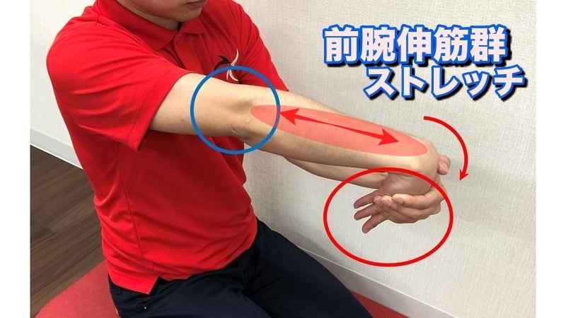 【ポイント】手首の後に指を曲げることで、より伸筋群を伸ばすことが出来ます。