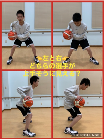 バスケでは前後、左右、上下など、どの方向にも動けることが求められます。そのため、いつ、どの方向にでも動けるような姿勢=パワーポジションが大事になります! 右の画像の選手は、左右で比べるとどちらの選手が上手そうに見えますか? なんとなく上手そうに見えている選手はいかにもすぐ動けそうな雰囲気を感じ取れると思います。それがパワーポジションです!