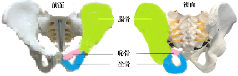 骨盤は寛骨(腸骨・坐骨・恥骨で構成)、仙骨、尾骨でできています。