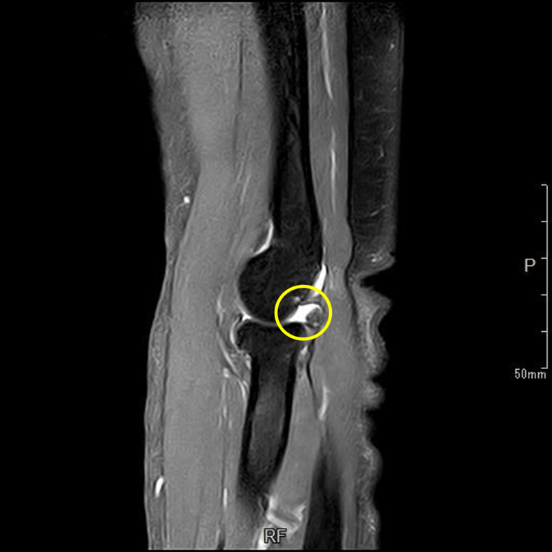 MRI③:関節の内部が腫れて肥厚している(黄丸)