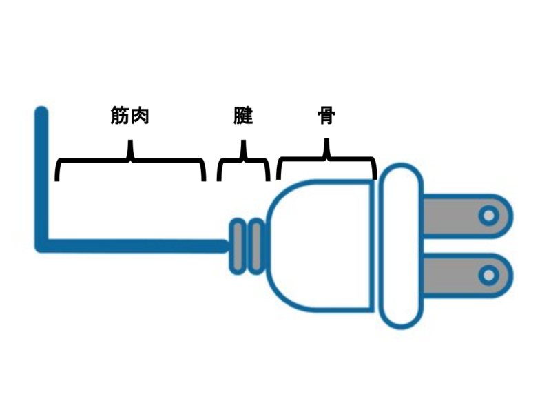 差し込みプラグを抜くさいにコード(筋肉)を引っ張るとコード(筋肉)とプラグ(骨)の間の部分(腱)に負荷がかかります。コード(筋肉)に負荷をかけ続けてしまうとコードとプラグ本体の間の部分(腱)が弱くなり壊れたことがある方は多いと思います。そのため、筋肉に負荷をかけ続ければ腱に負担がかかり変性してしまいます。