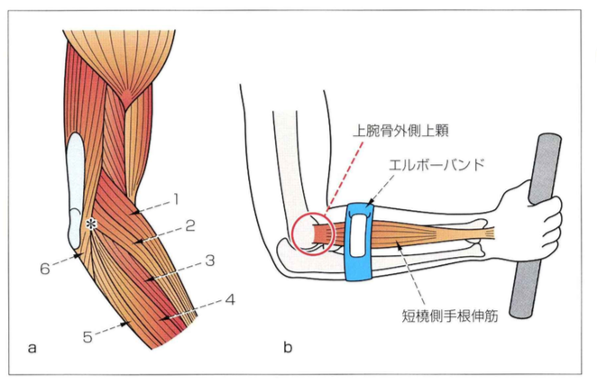 「肘のやや遠位で伸筋腱(短僥側手根伸筋腱)の筋腹を圧迫することで、指や手関節の仲筋腱の滑走を制限することで、本病態の主病巣である伸筋腱の外側上顆付着部にかかる負担を減らすこと」とするためとされているのが、一般的です。