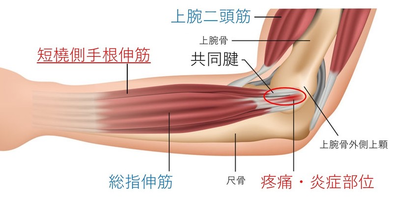 肘の外側から手や指へ位置しており、短橈側主根伸筋と総指伸筋、尺側手根伸筋は一緒になって上腕骨の外側に付きます。