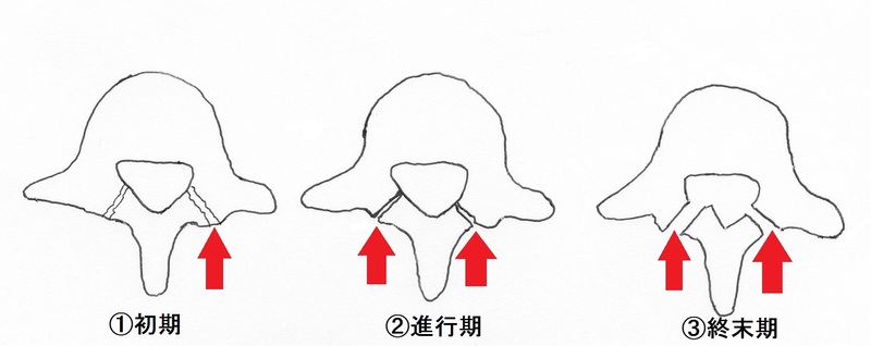 腰椎分離症の病期は、①初期、②進行期、③終末期に分類されます。