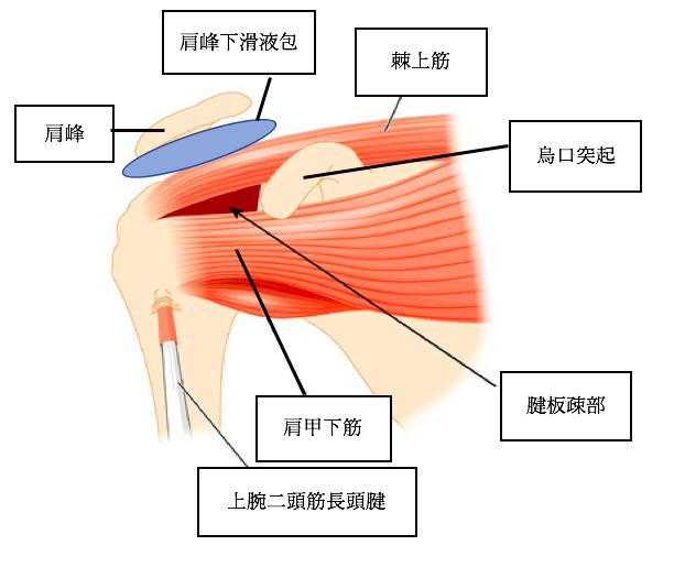 その腱板と肩峰との間に肩峰下滑液包という軟部組織があり、腱板(インナーマッスル)の働きをスムーズにします。