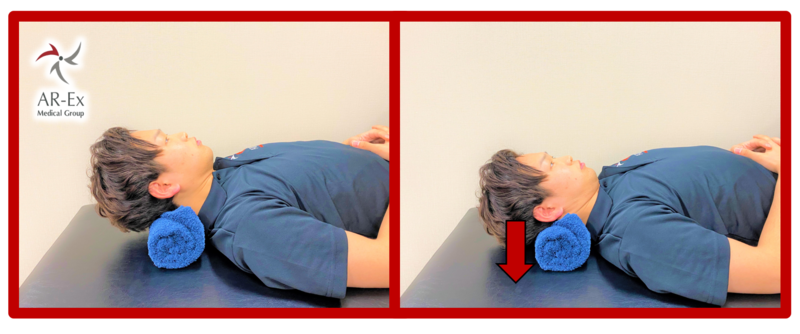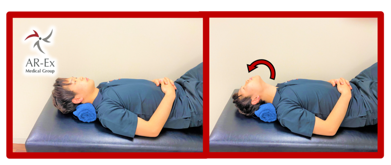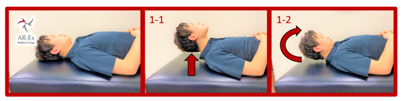 【方法】1-1:頭部を前方へ突出させる。ベッドに対して平行に出すイメージで行う。