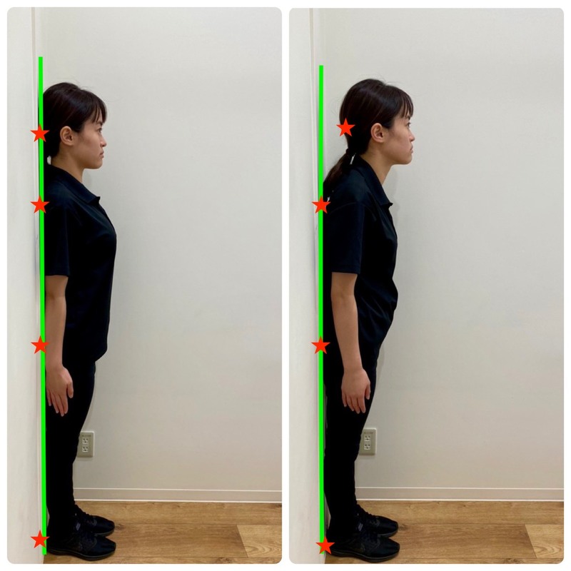 上の写真のように、★かかと、★おしり、★肩甲骨、★後頭部の順番に壁に背を向けてまっすぐ立ちます。後頭部が壁につけば問題ないのですが、右の写真のようにもし後頭部と壁の間に隙間があるのならストレートネックの可能性があります。どんなに頑張っても後頭部が壁につかないのであれば重症の可能性が高く注意が必要です。