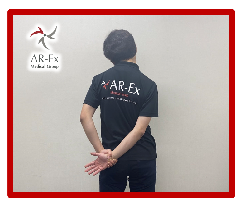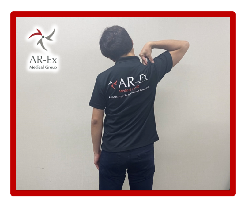 ・右手首を左手で持ち下方へ牽引し肩を下げ、固定する。