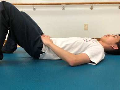 ①仰向けになり両膝を立て、手はおなかの上に置く