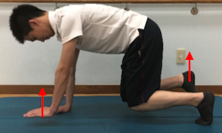 ②爪先を立て、手で床を押すように押しながら床から膝を上げて止まる