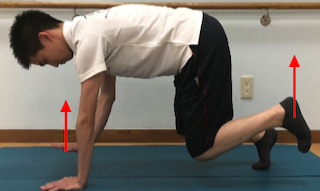 ②体勢が崩れないようにしっかり床を手で押しながら、対側の手足を交互に床から離す