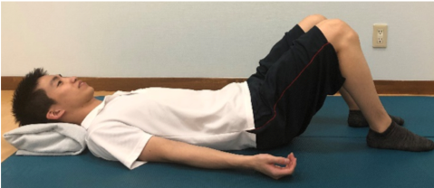 ①後頭部・肩甲骨・背骨がまっすぐになるように枕をいれ、仰向けに寝る。両膝をたて、手はリラックスして置く