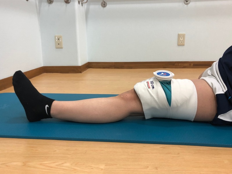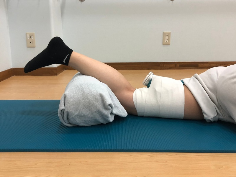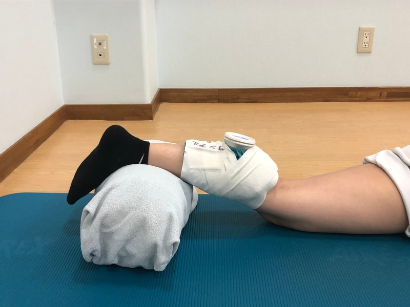 RICE処置は痛めた筋肉をゆるめたポジションで圧迫し、氷で冷やす(1回 20分)。