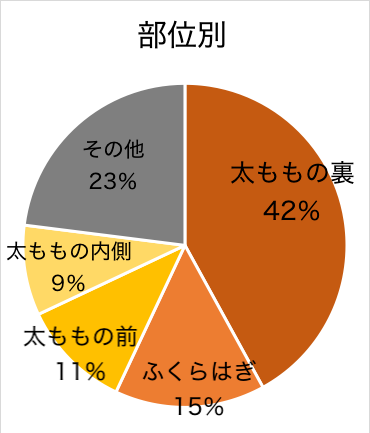 太ももの裏、太ももの前、ふくらはぎの筋肉に起こりやすいです。