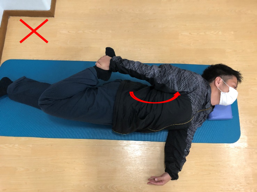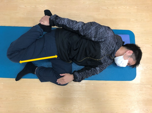 1. 横向きに寝た状態で下側の脚の股関節・膝関節を曲げます。