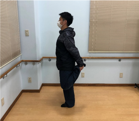 別法1. 立った状態で、膝を曲げて足首を掴み、股関節を伸ばします。