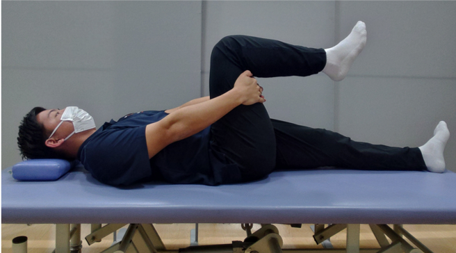 ①あおむけで片脚の膝の裏を両手で持ち自分の方に軽く引く
