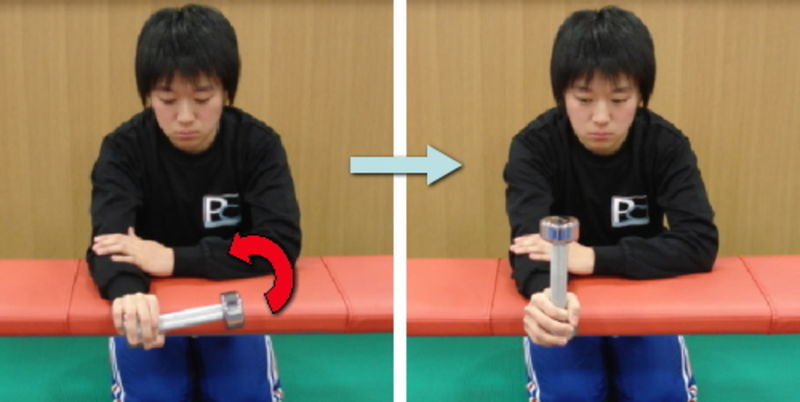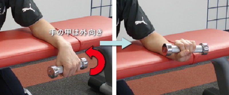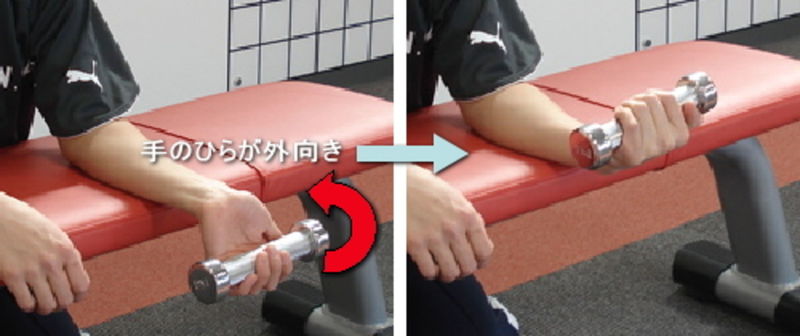 手のひらを上にダンベルが地面と水平になるようにセットします。このときダンベルは外側に向いています。ダンベルが垂直に立つまで前腕を回旋させ、トップで3秒止めた後またゆっくりと元の位置まで戻します。(例20回×3セット)