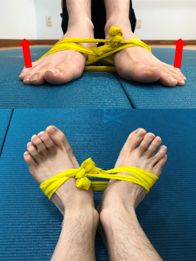 方法①両足に8の字を描くようにゴムチューブを結ぶ②両足を外側に広げながら小指を外くるぶしに近づけるように動かす回数 :10回×3セット