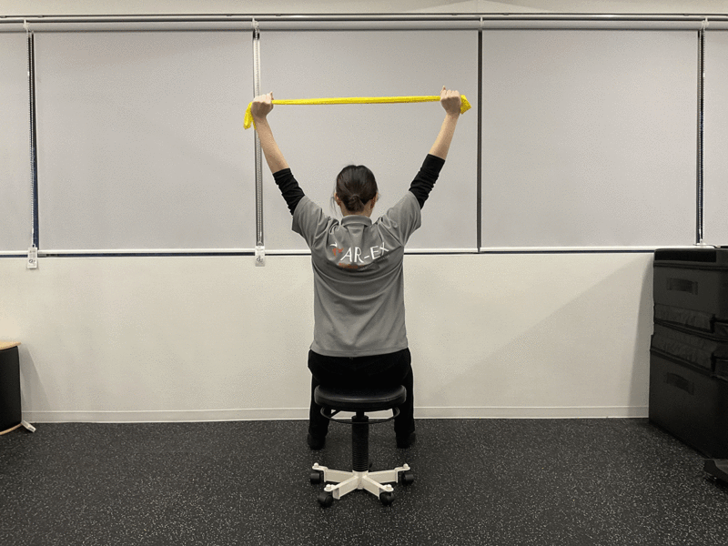 【方法】 1:椅子に背筋を伸ばして座る 2:両手をパーにし、肩幅よりやや広めに両手をバンザイする 3:背筋伸ばした姿勢を維持しながらゆっくりと肘を曲げながら下げていき、肩甲骨を寄せる 4:寄せきったら、バンザイを行い、上記動作を繰り返す【ポイント】 1:背筋は伸ばしておく 2:下を向かないよう、常に顔は前に向ける 3:肩甲骨を寄せるように行う 4:肘は後ろまでしっかりと引きつける