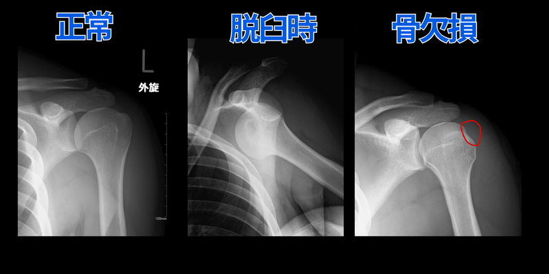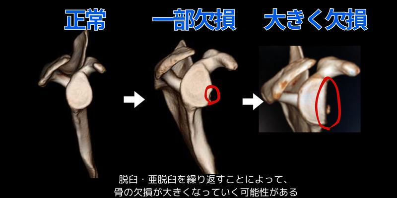 肩関節脱臼 を起こした場合、肩を安定させている軟部組織( 関節唇 や 関節包 )が損傷している可能性が高く、若年者やスポーツ選手、 骨欠損 が大きい場合は脱臼を繰り返す 反復性肩関節脱臼 に至るリスクが高いです。