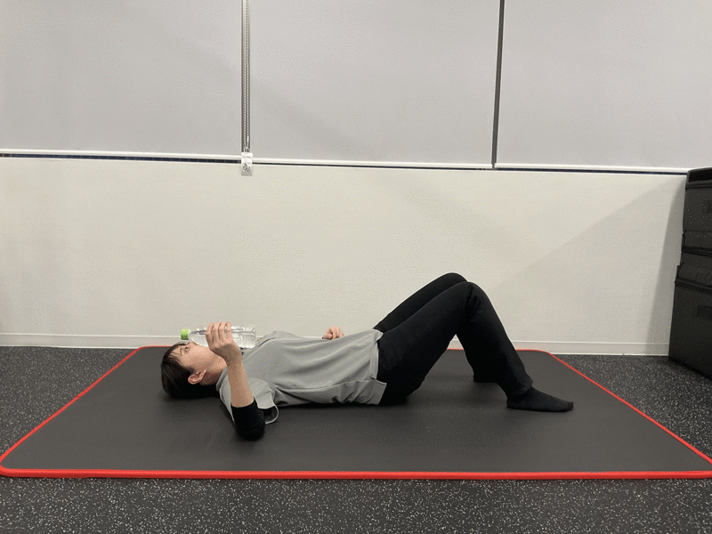 2:おへそを覗くように、頚椎から尾骨まで脊柱全体を丸めるようにする(肩甲骨外転・骨盤後傾)
