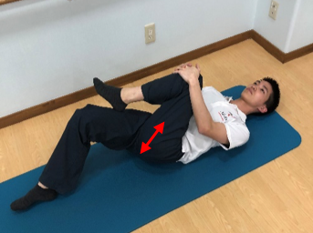 ②抱えた脚の膝を反対の肩に付けるように引く(左脚なら右肩)