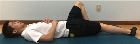 ①お尻にテニスボールを入れて仰向けになる