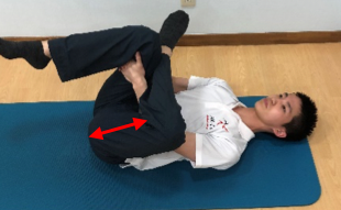 ①仰向けで脚を組み、上の脚の膝を抱える