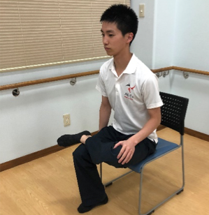 ①椅子に座り、片方の足首が反対の膝に乗るように脚を組む