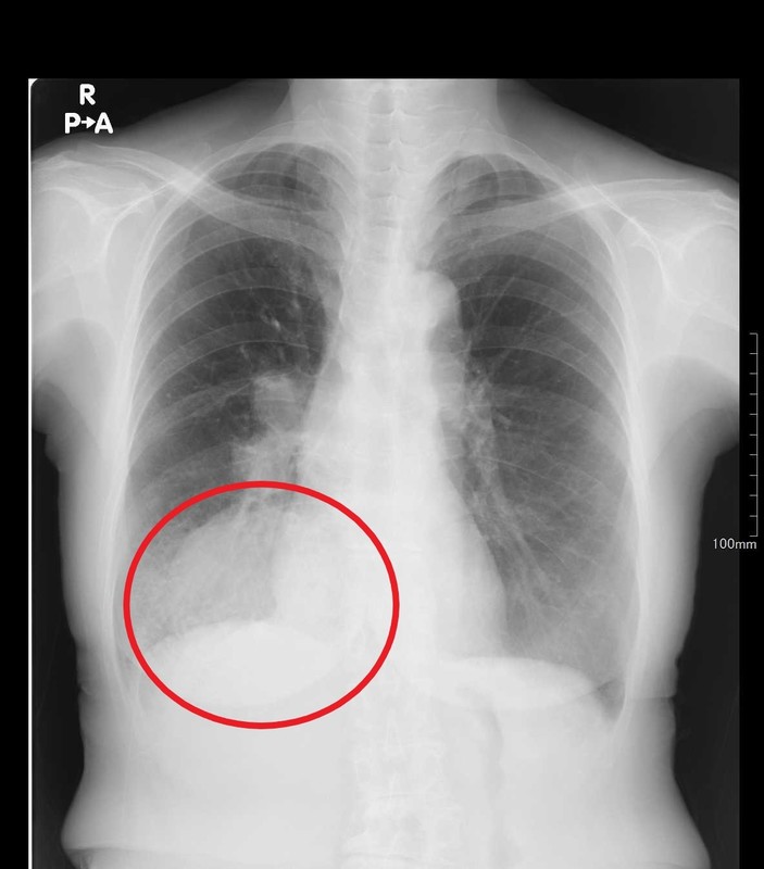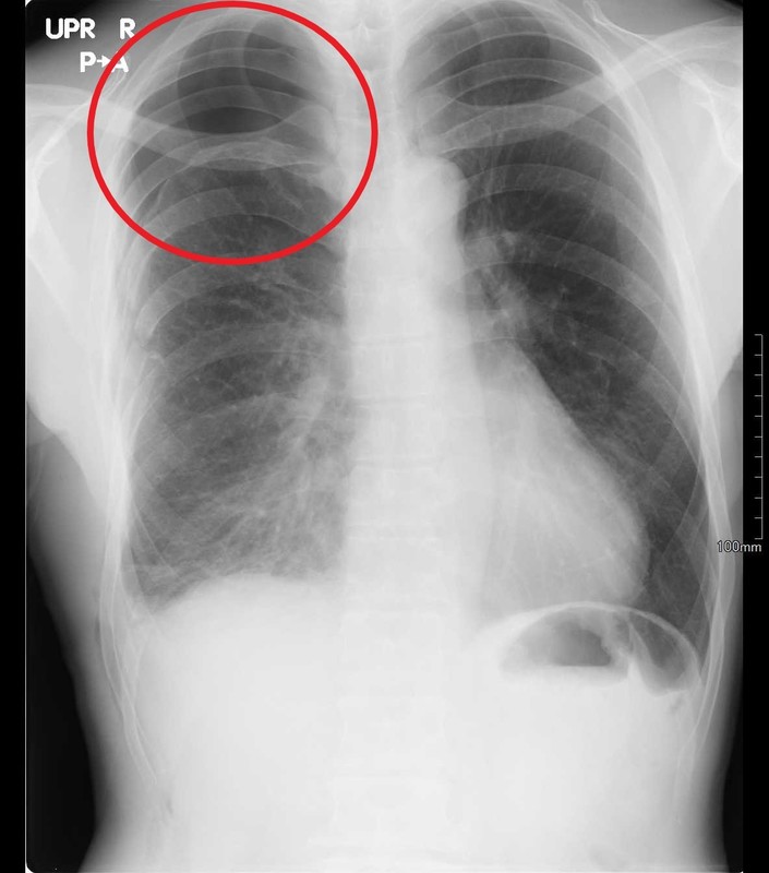 胸部レントゲン検査では、正常は肺の陰影が縮んでしまい漏れ出た空気で置き換わり黒くうつります。