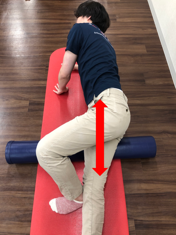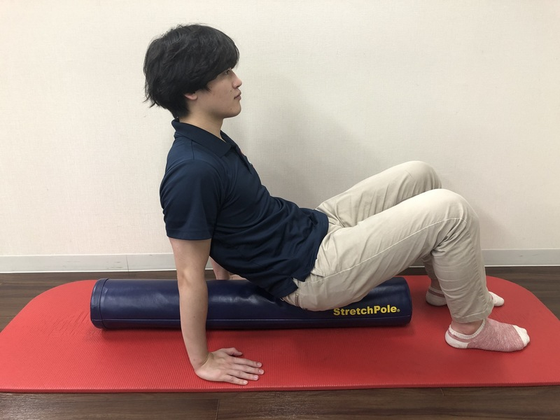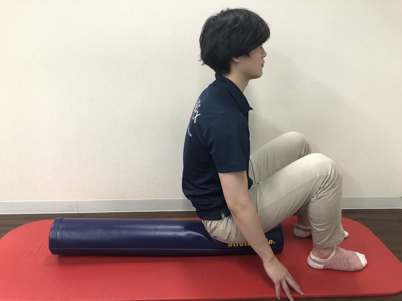 ②太ももの下にストレッチポールを横向きに置きます。