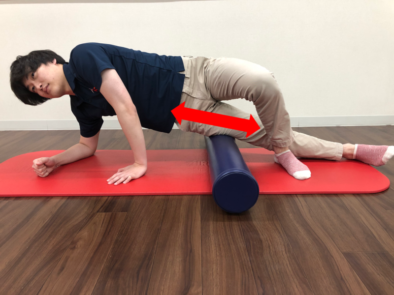 ②下側の太ももの下にストレッチポールを横向きに置きます。